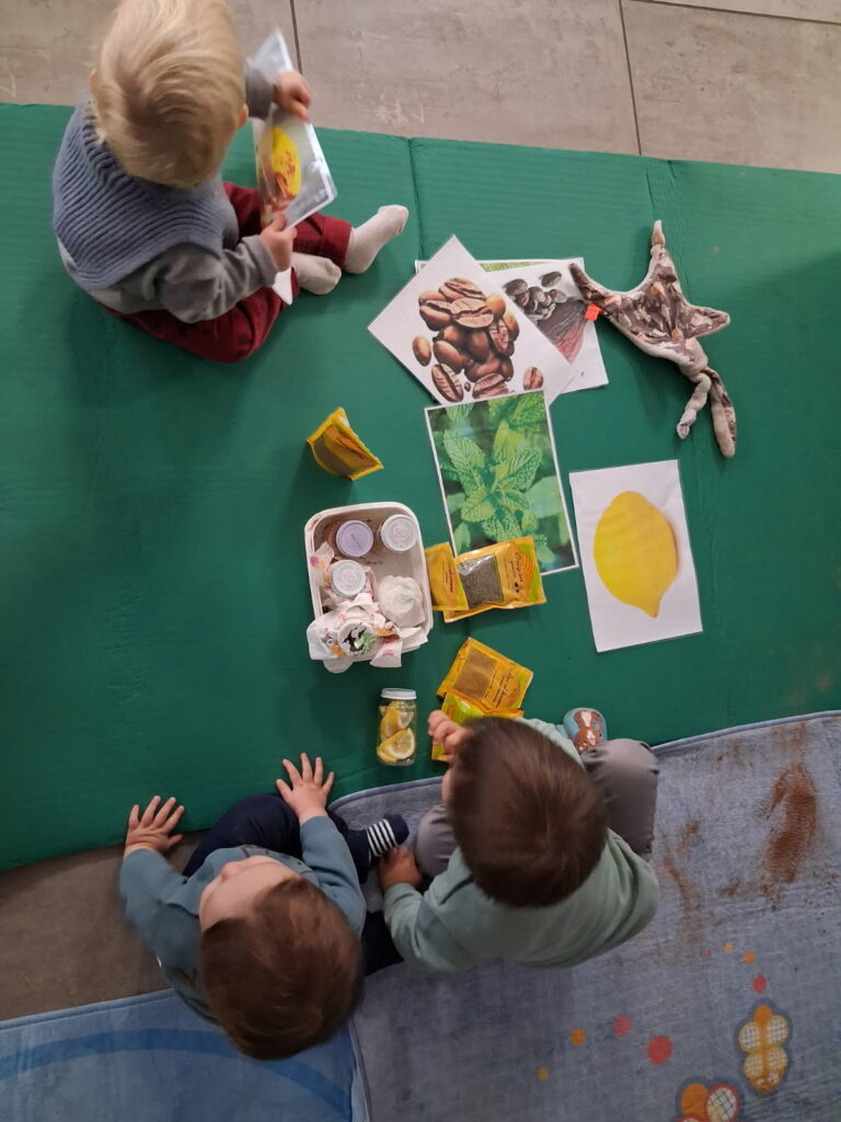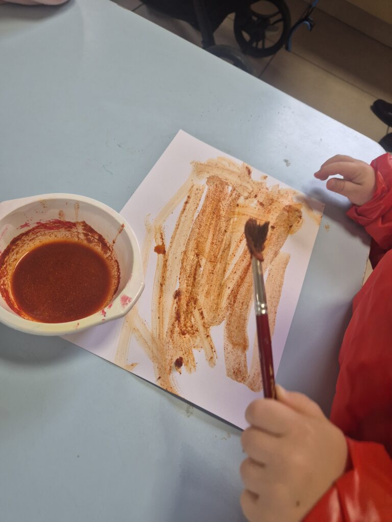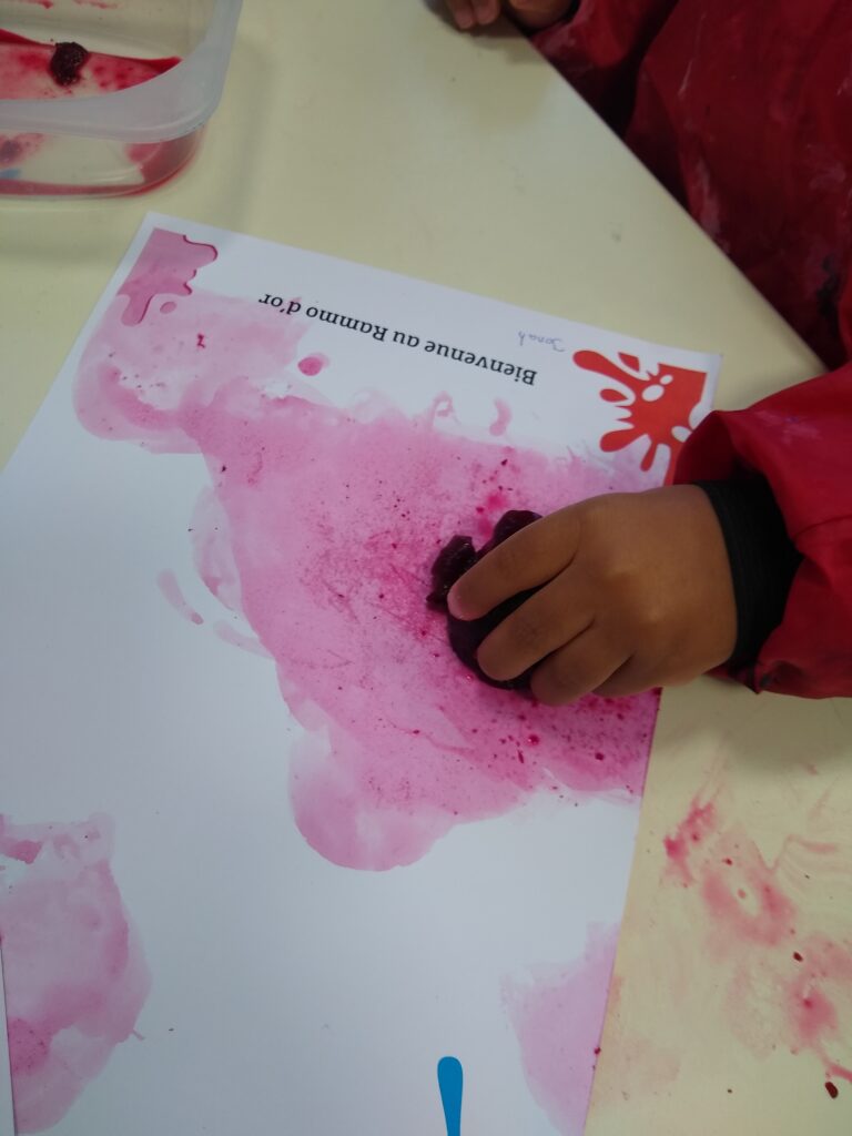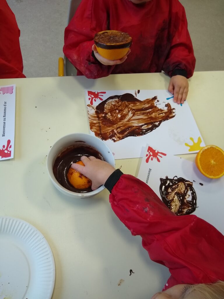 Peinture aux épices, peinture au chocolat, peinture à la betterave, atelier découverte du légumes/ fruit entier et transformé, ateliers des odeurs, eaux aromatisées,… .